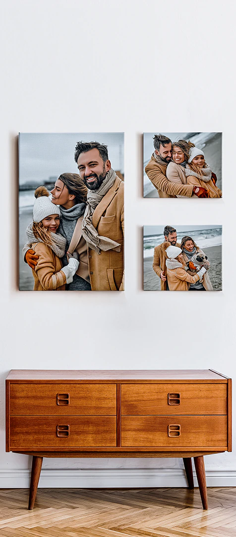 Créez le mur d'exposition de vos rêves avec des toiles et des tirages encadrés. Vous manquez de temps ? Laissez notre outil d'intelligence artificielle organiser leurs photos préférées.